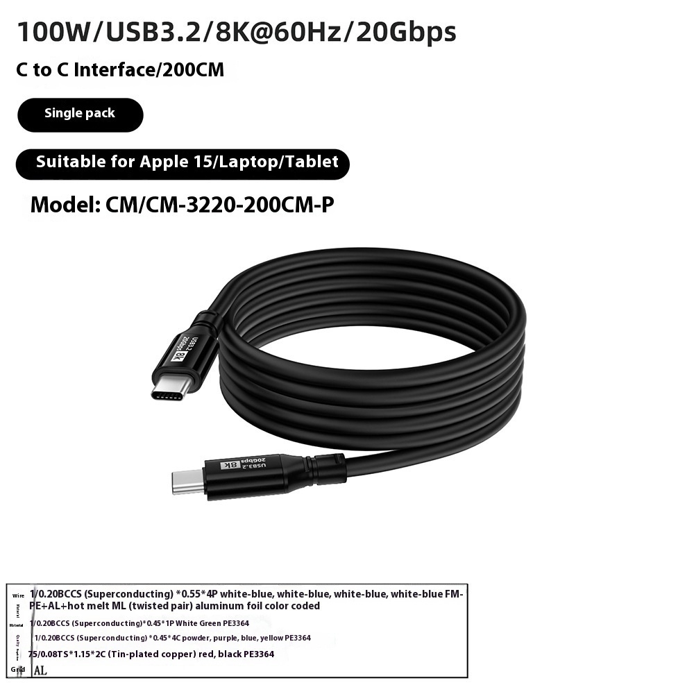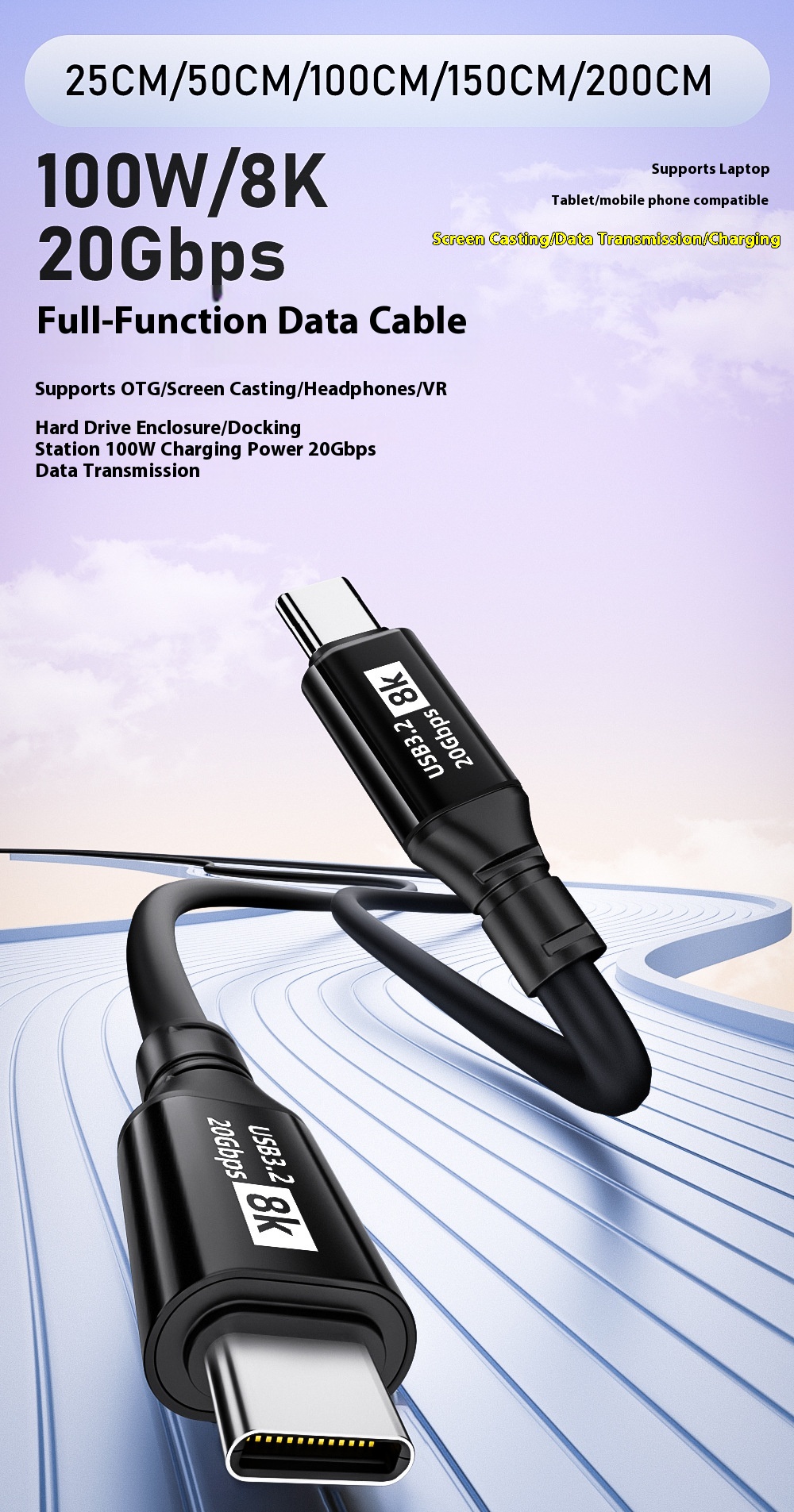 Product information:Features:Extended transmission Interface: TypeC Length: 1to2m Material: PVC Color classification: Black Voltage: 20V, 5A Power: 100W Transmission Rate: 20Gbps Resolution: 8K, 60Hz
